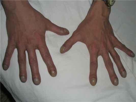 Пальцы – барабанные палочки (пальцы Гиппократа) представляют собой характерную деформацию дистальных отделов пальцев. Ногтевые фаланги колбовидно расширяются, ногти приобретают вид часовых стекол, из-за изменения подногтевых тканей становятся подвижными при надавливании. Угол между задним ногтевым валиком и ногтевой пластинкой составляет более 180 градусов.