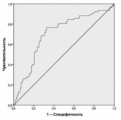 Следующим этапом работы была оценка методом ROC-анализа точки отреза (cut-off) ИММЛЖ по росту в степени 2,7 в отношении прогнозной принадлежности к группе ГЛЖ по данным двухфакторной логистической регрессионной модели. Результаты представлены на рис. 2. Получено значение AUC=0,704 (p=0,0001) и точки отреза ИММЛЖ с чувствительностью 68% и специфичностью 72%, равной 50 г/м 2,7 .