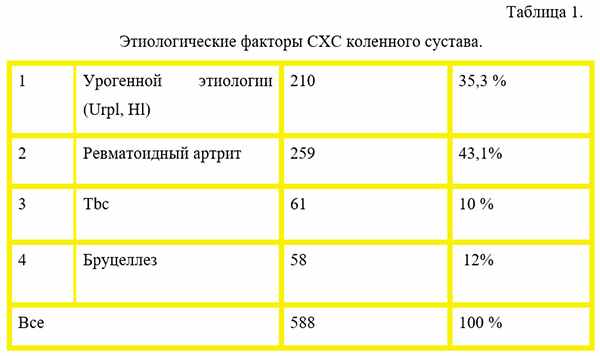 По данным нашей клиники, за период с 2003 по 2017 г. обследовано 588 больных с СХС коленного сустава разной этиологии (табл. 1). Женщин было 123 (20,5%), мужчин – 465 (79,5%), средний возраст составлял – 41,5 года.