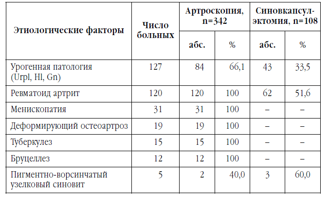 Больным СХС с ревматоидным артритом (120 чел.) была выполнена лечебно_диагностическая артроскопия коленного сустава. При неэффективности локальных внутрисуставных инъекций НПВП и выполненной артроскопии через 6 мес. 62 (51,7%) больным на фоне базисной и противовоспалительной терапии выполнена синовкапсулэктомия коленных суставов. У 31 больного СХС артроскопически установлена менископатия. После удаления мениска симптомы хронического синовита прекратились. Деформирующий остеоартроз коленных суставов в 32 случаях был причиной СХС. После лечебно-диагностической артроскопии, на фоне медикаментозной коррекции, скопление синовиальной жидкости не наблюдалось до 2,8 лет. Туберкулез и бруцеллез диагностирован в 15 и 12 случаях, соответственно. Диагностика производилась на основании общепринятых методов исследования (реакция Манту и Райт-Хеддельсона) и полимерно-цепной реакции (ПЦР). Этой группе больных выполнена диагностическая артроскопия. В последующем больные направлены в профильные учреждения.