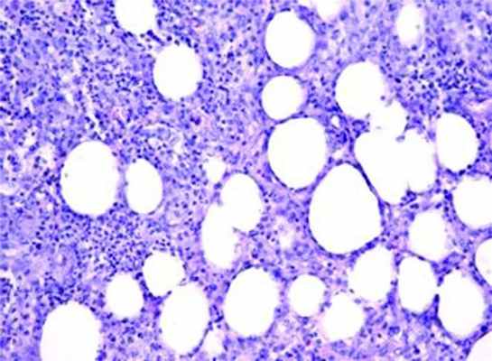 При гистологическом исследовании (рис. 2) Рисунок 2. Густая полиморфно-клеточная инфильтрация по ходу септальных перегородок в подкожно-жировом слое, стенки сосудов утолщены за счет пролиферации эндотелия, сосудистые просветы сужены. Окраска гематоксилином и эозином. Ув. 200. в дерме изменения выражены слабо, отмечены незначительный акантоз эпидермиса со слабым ортокератозом, гистиолимфоцитарная периваскулярная инфильтрация. В подкожно-жировой клетчатке обнаруживалась густая полиморфно-клеточная инфильтрация преимущественно по ходу септальных перегородок из гистиоцитов, лимфоцитов, нейтрофильных и эозинофильных гранулоцитов. Местами клеточные элементы инфильтрировали стенки сосудов, утолщенных вследствие отека и пролиферации эндотелиоцитов. Отмечалось выраженное сужение сосудистых просветов.