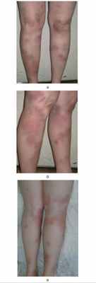 Локальный статус: преимущественно на передненаружных поверхностях голеней, а также на бедрах располагались эритематозно-узловатые поражения кожи диаметром от 2 до 6—8 см (рис. 1, а—в). Рисунок 1. Клинические проявления острой узловатой эритемы (а—в) у больной В., 27 лет. Эритема яркая, розово-красная; определялась значительная болезненность при пальпации узлов, последние имели различные размеры, преимущественно крупные, а также отмечалась склонность к слиянию. Границы высыпаний нечеткие из-за отечности окружающих тканей. При пальпации кожа над узлами горячая.