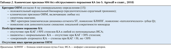 Таблица 2. Клинические признаки ИМ без обструктивного поражения КА (по S. Agewall и соавт., 2018) Примечание. БЛНПГ — блокада левой ножки пучка Гиса; ИСА — инфаркт-связанная артерия.