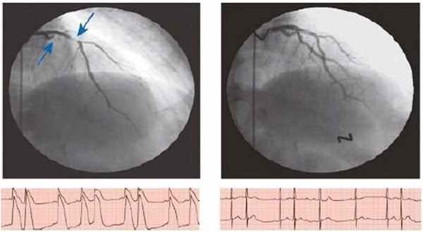 Причины развития такого спазма недостаточно выяснены. Ангиографические исследования 60-х годов показали, что ВВС имеет уникальный механизм, заключающийся в спазме (до состояния окклюзии/субокклюзии) эпикардиальной артерии, приводящем к кратковременной трансмуральной ишемии. На ЭКГ во время спазма КА обычно регистрируется элевация сегмента ST, при КАГ — локальный окклюзирующий спазм (по А. Кэмм и соавт., 2011) [7] (рис. 2).