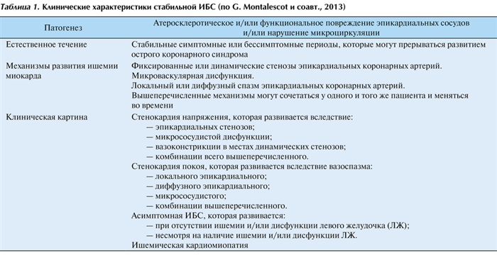 Таблица 1. Клинические характеристики стабильной ИБС (по G. Montalescot и соавт., 2013) В любом случае стабильная симптомная или бессимптомная фазы заболевания в какой-либо момент могут прерваться развитием ОКС.