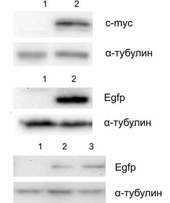 Далее для проверки функциональности рекомбинантных плазмид получали аденовирусы в соответствии с опубликованным протоколом [3]. Проводили 3 раунда амплификации вирусных стоков, после чего инфицировали клетки HEK293 для проверки продукции соответствующих белков. На рис. 2 показаны Рис. 2. Вестерн-блот анализ лизатов клеток линии HEK293, инфицированных рекомбинантными аденовирусами. Клетки HEK293 рассевали в количестве 1·10 5 в лунку 24-луночного планшета, на следующий день инфицировали аденовирусами, через 48 ч после инфекции получали клеточные лизаты и проводили Вестерн-блот анализ с использованием указанных антител. Клетки инфицировали аденовирусами для продукции белков (а) NICD-myc (дорожка 2), (б) Egfp-Pak5 (дорожка 2) и (в) Egfp-Pdcd4 RBM12 S457A и Egfp-Pdcd4 RBM12 D235A D418A, дорожки 2 и 3 соответственно. Дорожка 1 во всех панелях — неинфицированные клетки. результаты вестерн-блот анализа лизатов клеток, инфицированных стоками аденовирусов для продукции белков Egfp-Pdcd4 RBM12 S457A, Egfp-Pdcd4 RBM12 D235A D418A, Egfp-Pak5 и NICD-myc. Как видно, все полученные аденовирусы экспрессируют кодируемые шаттл-векторами кДНК.