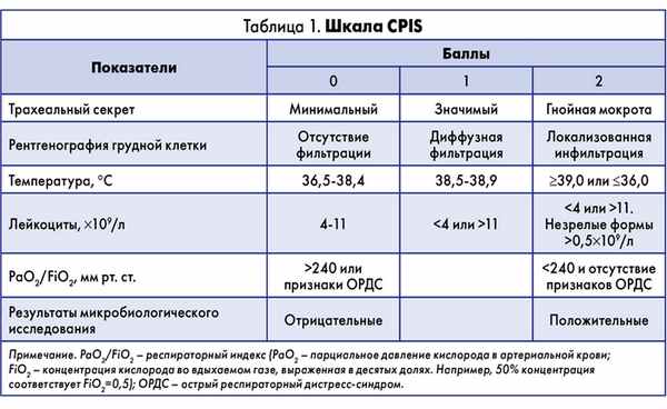 В настоящее время наиболее часто применяемой и надежной для диагностики НП и ВАП считается шкала CPIS (Clinical Pulmonary Infection Score). Она разработана специально для диагностики НП, однако имеет низкую чувствительность и специфичность (табл. 1).
