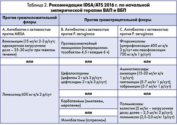 Для эмпирического лечения ВАП предлагается использовать один антибиотик у пациентов без факторов риска развития резистентности или у пациентов в ОИТ, где к препарату, рассматриваемому для монотерапии, резистентны менее 10% изолятов. У пациентов с ВАП рекомендуется избегать назначения аминогликозидов, а также колистина, если доступны прочие агенты с адекватной активностью против грамотрицательных микроорганизмов (табл. 2). У пациентов со структурным поражением легких, повышающим риск возникновения грамотрицательных инфекций (бронхоэктазы, муковисцидоз), рекомендована комбинация двух антисинегнойных препаратов.