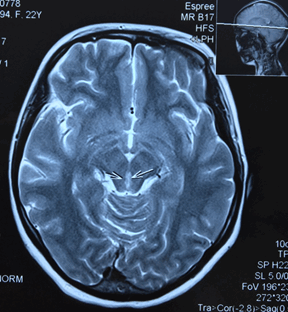 МРТ головного мозга без контрастирования пациентки Ч. Поражение вещества мозга по ходу паравентрикулярных отделов варолиева моста, водопровода и медиальных отделов таламуса