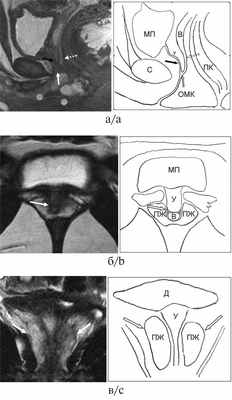 а — сагиттальная плоскость; б — аксиальная плоскость; в — фронтальная плоскость. На изображениях визуализируются уретра (черная стрелка), влагалище (белая пунктирная стрелка) с наличием в просвете небольшого количества жидкости. Уретровагинальный конфлюенс (белая стрелка) определяется на уровне средней трети симфиза. Круглыми МРТ метками на рис. а обозначены наружное отверстие общего мочеполового канала, расположенное ближе к симфизу, и проекция входа во влагалище, расположенного ближе к прямой кишке. Визуализируется ткань предстательной железы (головки черных стрелок), эллипсоидной формы, без четкой зональной дифференцировки, размерами 34×15×32 мм (объем 8,4 см 3 ) без видимых очаговых изменений в структуре. МП — мочевой пузырь, С — симфиз, У — уретра, В — влагалище, ОМК — общий мочеполовой канал, ПК — прямая кишка, ПЖ — предстательная железа, Д — детрузор мочевого пузыря.