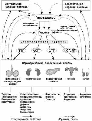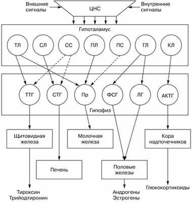 ТЛ — тиреолиберин; СП — соматолиберин; СС — соматостатин; ПЛ — пролактолиберин; ПС — пролактостатин; ГЛ — гонадолиберин; КЛ — кортиколиберин; ТТГ — тиреотропный гормон: СТГ — соматотропный гормон (гормон роста): Пр — пролактин; ФСГ — фолликулостимулирующий гормон: ЛГ — лютеинизирующий гормон; АКТГ — адренокортикотропный гормон. Сплошными стрелками обозначено активирующее, пунктирными — ингибирующее влияние