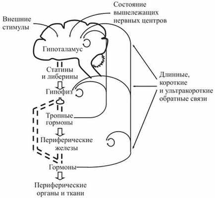 Рис. Прямые и обратные связи системы гипоталамус-гипофиз-периферические железы