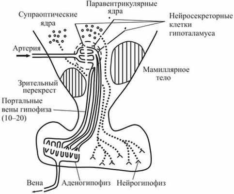 Клетки гипоталамуса обладают двойной функцией. Во-первых, они выполняют те же функции, что и любая другая нервная клетка, а во-вторых, обладают способностью секретировать и выделять биологически активные вещества - нейрогормоны (этот процесс называют нейросекрециеи). Гипоталамус и передняя доля гипофиза связаны общей сосудистой системой, имеющей двойную капиллярную сеть. Первая располагается в районе срединного возвышения гипоталамуса, а вторая — в передней доле гипофиза. Ее называют воротной системой гипофиза.