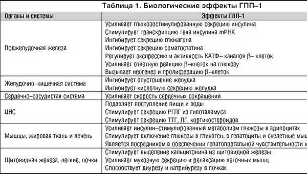 Множественные биологические эффекты ГПП–1 проявляются на самых различных уровнях (табл. 1).