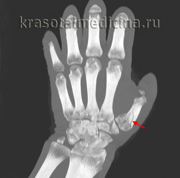 Область повреждения отечна, резко болезненна. При пальпации иногда удается прощупать костный фрагмент в области «анатомической табакерки». Диагноз перелома первой пястной кости подтверждается рентгенограммами.