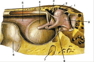 Латеральная (наружная) стенка барабанной полости: 1 - надбарабанное углубление; 2 - верхняя связка молоточка; 3 - рукоятка молоточка; 4 - барабанная перепонка; 5 - барабанное отверстие слуховой трубы; 6 - колено внутренней сонной артерии; 7 - второе (вертикальное) колено лицевого нерва; 8 - барабанная струна; 9 - наковальня