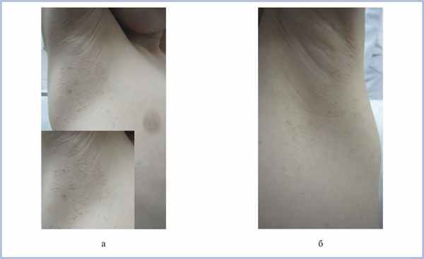 Клинические проявления множественной стеатоцистомы у пациента М., 6 лет. Высыпания располагаются симметрично в области правой (а) и левой (б) подмышечных впадин.