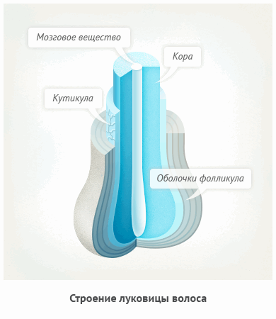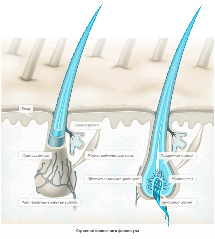 Волос состоит из стержня, который находится над кожей, и фолликула - невидимой части корня волоса, располагающейся в дерме, под поверхностным слоем кожи эпидермисом.