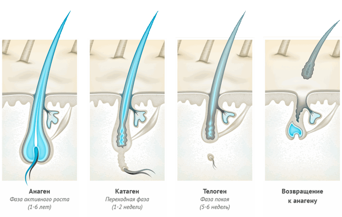 Затем стадия телогена постепенно переходит к анагену, стадии активности.