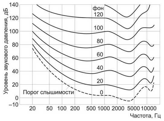 В связи с особенностью восприятия слухового анализатора звук одинаковой громкости будет восприниматься человеком от источников шума с различными физическими параметрами. Так, звук силой в 50 дБ и частотой 100 Гц будет восприниматься как одинаково громкий со звуком с силой 20 дБ и частотой 1000 Гц.