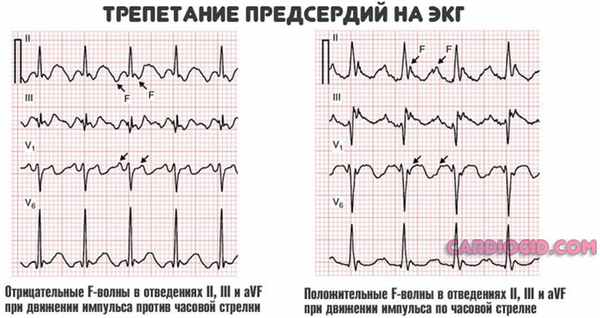 Трепетание предсердий — правильный эктопический предсердный ритм с частотой, превышающий уровень суправентрикулярной пароксизмальной тахикардии — более 220/мин. При трепетании предсердий между волнами Р не видно изолинии, как при предсердной тахикардии.