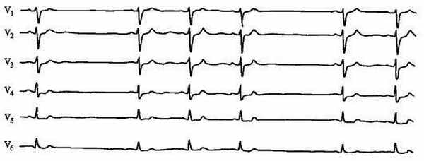 Предсердная тахикардия — внезапно начинающийся и внезапно заканчивающийся приступ сердечных сокращений до 140−250уд/мин при сохранении правильного ритма. Наличие перед каждым QRS сниженного, деформированного, двухфазного или отрицательного P.