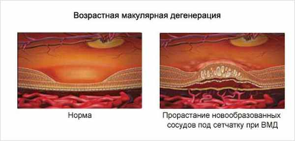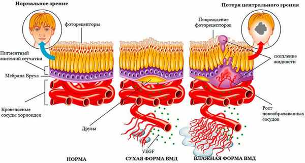 Существуют две формы ВМД: «сухая» (или атрофическая) дегенерация, которая возникает при понижении плотности пигмента макулы и может переходить во «влажную» (или экссудативную). Хотя «влажная» форма составляет всего около 10-20% от всех случаев ВМД, именно она часто является причиной слепоты. При этой форме заболевания со стороны сосудистой оболочки глаза начинается врастание новообразованных сосудов под сетчатку. Эти сосуды формируют субретинальную неоваскулярную мембрану. Пропотевание жидкости из неоваскулярной мембраны ведет к локальной отслойке слоев сетчатки и неизбежной гибели фоторецепторов — палочек и колбочек. Белковый экссудат, кровоизлияния усугубляют ситуацию, приводя к формированию грубого рубца в макуле и необратимому ухудшению зрения.
