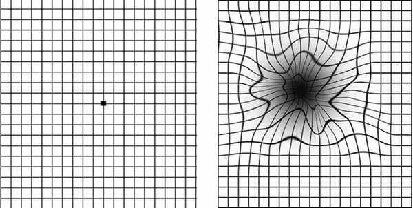 · Сетка Амслера. Врач также может попросить посмотреть Вас на специальную сетку. Изменения центрального зрения могут приводить к исчезновению или искажению линий.