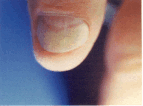 Изменения ногтя. При обследовании следует обращать внимание на цвет и прозрачность, толщину пластинки, характер ее поверхности, прочность и целостность (длина, форма свободного края, наличие трещин, связь с окружающими структурами).