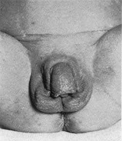 У мальчиков с рождения отмечается увеличение полового члена, кожа мошонки морщинистая, выражена пигментация шва полового члена, кожи мошонки, передней линии живота, ареолы сосков.