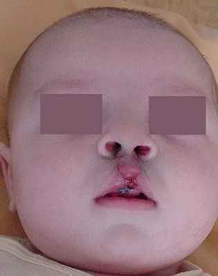 Врождённые расщелины губы и нёба (cheiloschisis) – это расщепление мягких тканей в средней части губы (разг. «заячья губа») и/или разрыв нёба (разг. «волчья пасть»). Этот тяжёлый порок развития челюстно-лицевой области сопровождается грубыми функциональными нарушениями. Кроме того, особенностью этой патологии является выраженная деформация носа в виде укорочения перегородки носа, уплощение кончика и крыльев носа. Патологически прикреплённые мышцы верхней губы и приносовой области ещё больше усугубляют эти деформации.