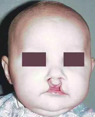 При полных расщелинах дефект захватывает все ткани верхней губы от красной каймы до основания носового хода. Во всех случаях наблюдается деформация кожно-хрящевого и костного отделов носа. При двусторонней расщелине верхней губы кожная часть перегородки носа укорочена, пролябиум выступает кпереди, кончик носа уплощен, часто раздвоен, крылья носа с двух сторон растянуты и уплощены.