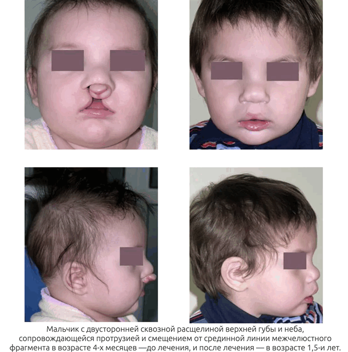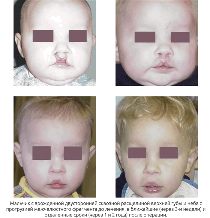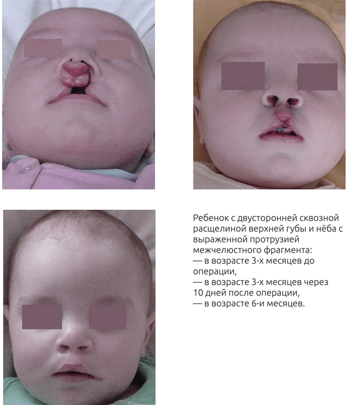 При двусторонних сквозных расщелинах верхней губы и нёба особенно важно выполнить первичную двустороннюю хейлоринопластику в возрасте 4-5 месяцев. Помимо достижения косметического результата важно устранить протрузию межчелюстного фрагмента (выступания средней части верхней губы и верхней челюсти вперед).