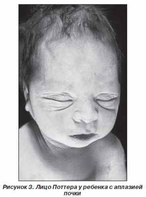 Клиника. Для детей с этой патологией характерны лицевые дисморфии — выступающие лобные бугры, деформированные низко расположенные ушные раковины, широкий плоский нос, микрогнатия, гипертелоризм глаз, эпикант, одутловатость лица — лицо Поттера (рис. 3). Вследствие маловодия и компрессии плода наряду с типичным лицом практически у 100 % детей с данным пороком наблюдаются вторичная гипоплазия легких и деформация нижних конечностей (вывих тазобедренных суставов, косолапость), чрезмерная складчатость кожи и увеличение размера живота. Почти половина детей с агенезией почек рождаются недоношенными. Порок летальный — дети с агенезией (аплазией) обеих почек рождаются мертвыми или умирают в первые дни после рождения, хотя описаны случаи жизни детей без почек в течение 10–23 дней.