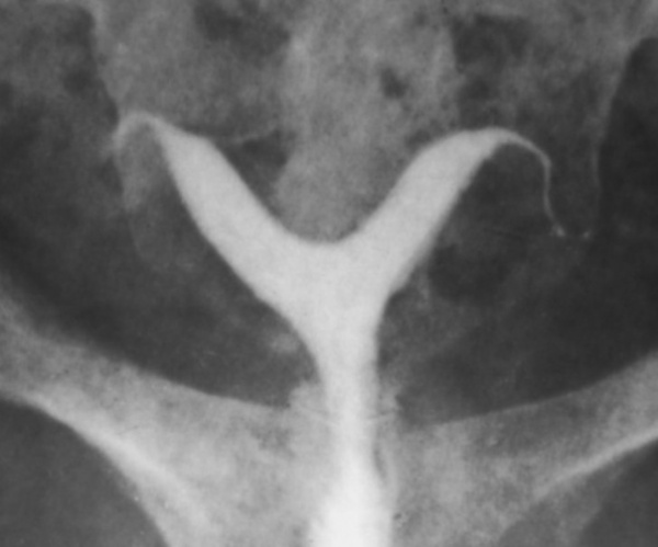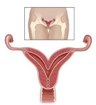 Формируется при неполном слиянии средней части мюллеровых протоков. Имеет две полости и одну шейку, реже – две шейки, соединяющиеся с одним нормальным влагалищем либо с влагалищем, разделенным частичной перегородкой. В 20% случаев аномалий развития матки выявляется полная двурогая матка – орган с двумя отдельными полостями. Неполная двурогая матка напоминает символическое изображение сердца, имеет общую полость и измененное дно, разделенное более или менее выраженным выступом.