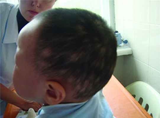 У детей грудного возраста также может наблюдаться диффузная или мелкоочаговая алопеция, а также поражение ногтей в виде онихий и паронихий (рис. 3). Рисунок 3. Мелкоочаговая алопеция у ребенка 11 мес с РВС.