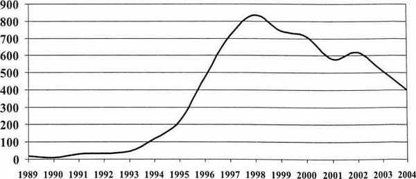 В настоящее время вновь возрос интерес к вопросам диагностики, лечения и профилактики врожденного сифилиса. Это обусловлено тем, что вслед за начавшейся с 1989 года эпидемией приобретенного сифилиса среди взрослого населения последовал закономерный рост заболеваемости врожденным сифилисом (рис. 1).