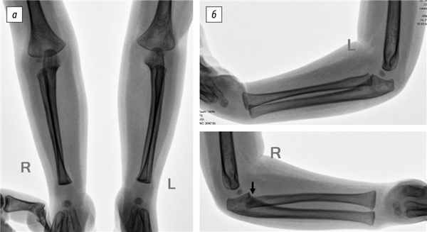 1. Рис. 1. Рентгенография локтевых суставов и костей предплечья в возрасте 4 лет. Подвывих головки правой лучевой кости (указан стрелкой): а — прямая проекция; б — боковая проекция