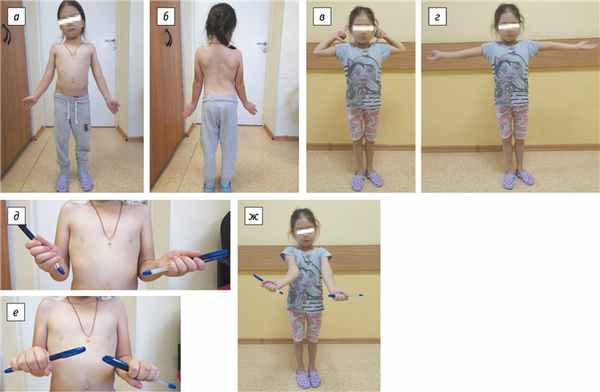 2. Рис. 2. Клинический осмотр: а, б — воронкообразная деформация грудной клетки, грыжа пупочного кольца, деформация позвоночника, асимметрия надплечий, углов лопаток, треугольников талии (D > S), вальгусная деформация на уровне правого локтевого сустава 20°; в, г — амплитуда сгибания и разгибания в локтевых суставах в пределах нормальных значений; д, е — ограничение ротационных движений правого предплечья (супинация — 0°, пронация — 35°); ж — компенсаторная наружная ротация плеча с приведением при попытке максимальной супинации правого предплечья