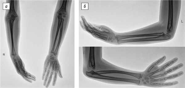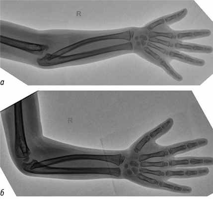 3. Рис. 3. Рентгенография локтевых суставов с захватом костей предплечья в возрасте 7 лет. Задний подвывих костей предплечья в положении сгибания: а — прямая проекция; б — боковая проекция
