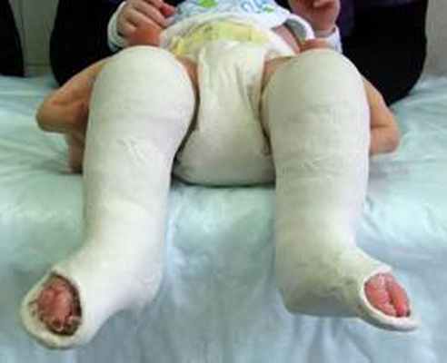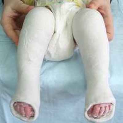 Лечение детей с врожденной косолапостью начинают уже с первых недель жизни ребенка с использованием консервативных методик. К ним относится массаж, бинтование, этапное гипсование и др. По данным разных авторов, этапное гипсование может быть эффективным в 40-90% случаев.