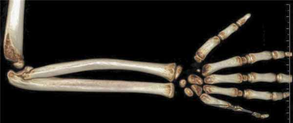 4. Рис. 4. Компьютерная томограмма правого локтевого сустава. Гипоплазия головки правой лучевой кости, скошенность ее суставной поверхности, вывих головки лучевой кости