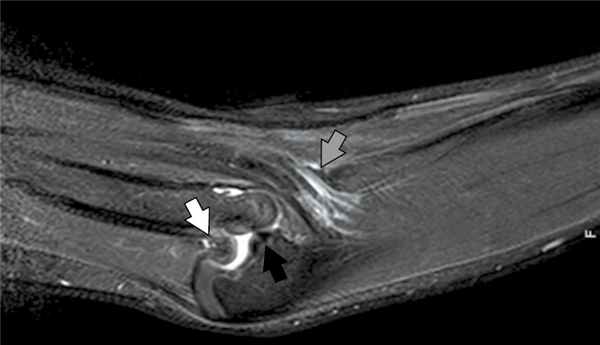 6. Рис. 6. Магнитно-резонансная томограмма правого локтевого сустава. Дупликатура сухожилия трехглавой мышцы плеча (белая стрелка), растянутость сухожилия плечевой мышцы (серая стрелка), подвывих в плечелучевом суставе (черная стрелка)