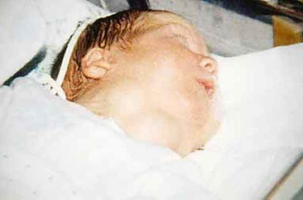На 40-й неделе беременности произведено плановое кесарево сечение. Масса тела ребенка при рождении 4100 г, рост 55 см, окружность головы 36 см, груди – 34 см. Мальчик извлечен в состоянии тяжелой асфиксии (оценка по шкале Апгар 4/6 баллов), при рождении отмечен зоб гигантских размеров (в поперечнике 15 см, сагиттальный размер 8 см, рис. 1). В течение 15 дней проводилась ИВЛ.