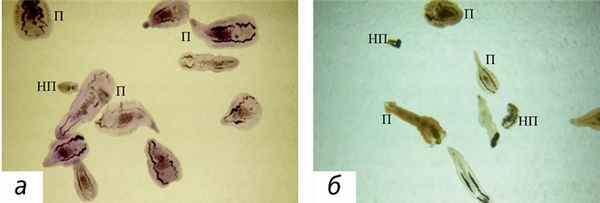Рис. 1. Мариты‚ выделенные из желчных протоков печени мышей через 6 мес после однократного (а) и двукратного (б) инфицирования личинками трематоды O. felineus. У половозрелых марит (П) видна продукция яиц‚ у неполовозрелых (НП) – только 2 ветви кишечника