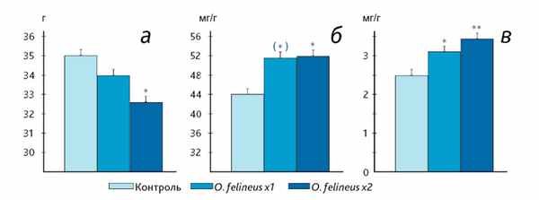 Поскольку в природных популяциях инфицирование млекопитающих происходит зачастую многократно, в нашей работе исследовали эффективность инфицирования и развитие паразитов при однократном и двукратном введении личинок трематоды O. felineus мышам линии C57BL/6J. При этом планировали оценить не только степень инфицирования животных, но и их состояние по ряду физиологических показателей, поскольку известно, что кратность заражения во многих случаях коррелирует со степенью проявления патологических признаков у хозяина паразита [12].