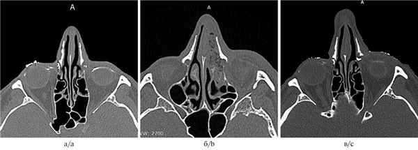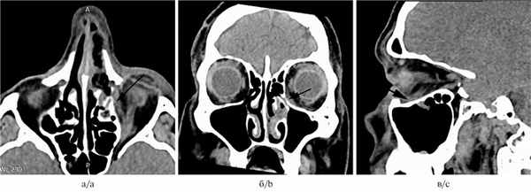 В 2019 г. в НИИ глазных болезней обратился пациент К., 50 лет, с диагнозом: левосторонний хронический дакриоцистит, облитерирующая форма. Диагноз был установлен с учетом данных компьютерной томографии, выполненной с контрастированием слезоотводящих путей (рис. 1, а). При изучении сканограмм обращало на себя внимание истончение слезной кости и лобного отростка верхней челюсти.