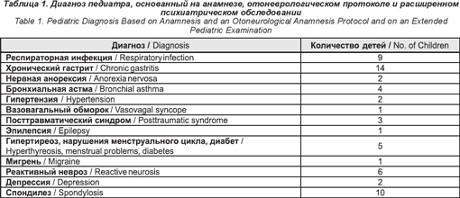 Мы задались вопросом, почему головокружения часто сопровождались респираторными нарушениями и гастритами. Более того, также возник вопрос, почему во время отоневрологического обследования в большинстве случаев не выявлялись симптомы нарушения функции вестибулярного аппарата. Вероятно, здесь должна рассматриваться возможность психогенного головокружения, которое выявил Lin и др. [20] у 13 % пациентов, предъявляющих жалобы на головокружения на протяжении не менее 12 лет. В исследовании Lin патологии при электронистагмографии выявлялись редко. Мы согласны с тем, что для лечения детей с голово-кружениями следует обращать внимание не только на параметры, связанные с деятельностью органов, но также на жалобы функционального характера [21]. Такие жалобы могут быть следствием посттравматического синдрома (даже некоторое расстройство сна), депрессии, невроза, диеты, побочных эффектов от приема антибиотиков, кортикостероидов и других лекарственных средств (у детей из нашей группы — препаратов, которые они принимали по поводу гастрита, бронхиальной астмы и пр.) [22].