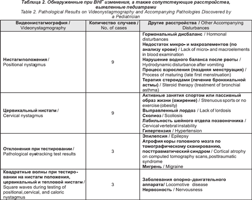 У 18 из 30 детей патологии при проведении ВНГ выявлено не было. У остальных 12 детей были выявлены те или иные изменения. В табл. 2 приведены все изменения, выявленные на ВНГ, а также сопутствующие нарушения. Как говорилось выше, на ВНГ выявлено только 4 вида патологических изменений при проведении тестов позиционного, цервикального нистагма и теплового теста: нистагм положения, цервикальный нистагм, отклонения в результатах исследования направления взгляда и движения глаз, отклонения квадратных волн.