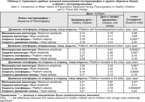 Постурография проводилась при помощи подвижной платформы Freyss (Synapsys). Это обследование состояло из 4 последовательных этапов: движение платформы вперед-назад с открытыми и закрытыми глазами, движение платформы из стороны в сторону с закрытыми и открытыми глазами. Определялись 4 параметра: 1) максимальная амплитуда, 2) средняя амплитуда отклонения платформы, 3) средняя скорость колебаний платформы, 4) средняя скорость головы. Последний параметр измерялся при помощи специального детектора, зафиксированного на голове пациента.